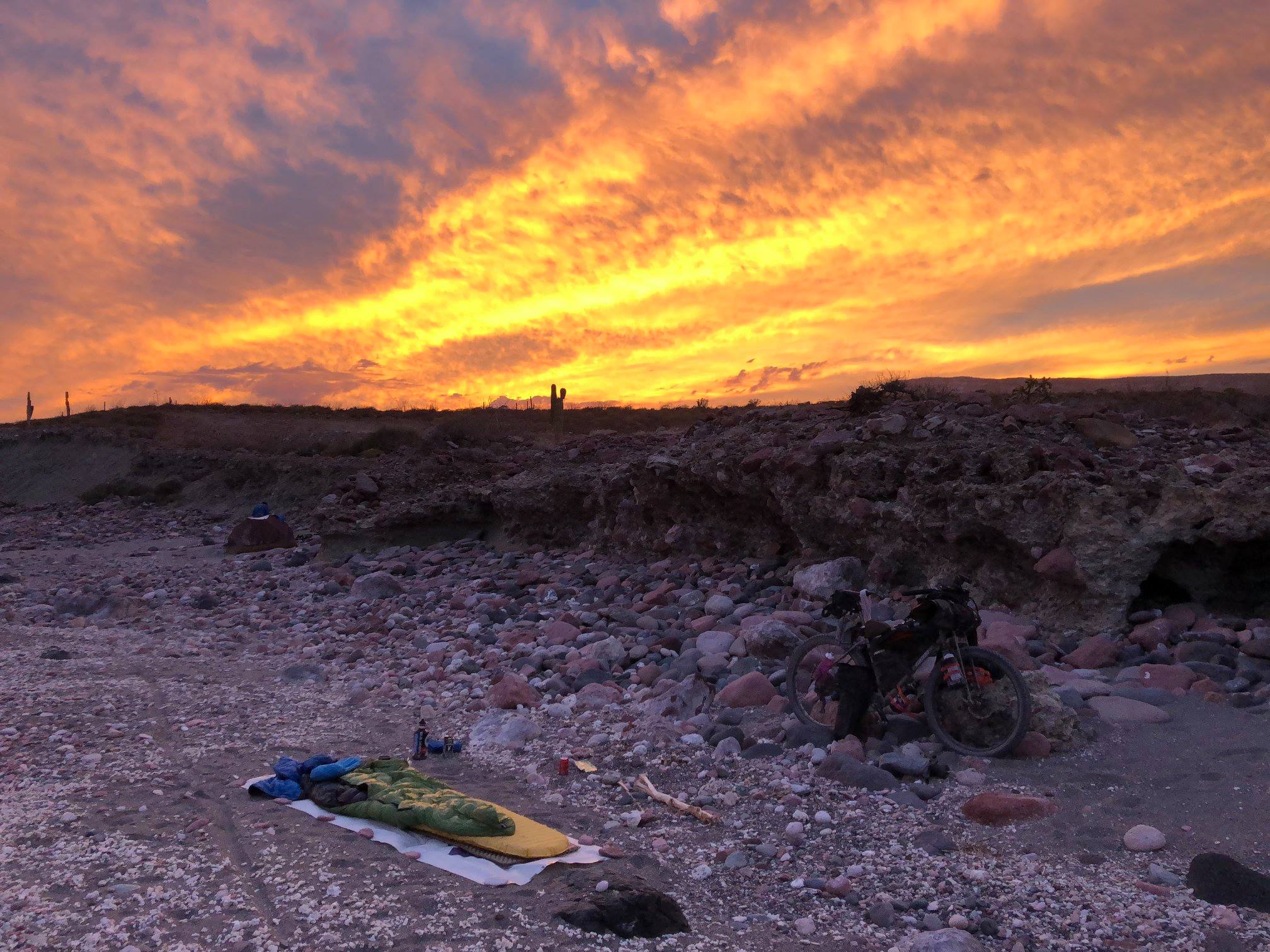 Descending into the Bahia de Los Angeles (Bay of the Angels) provides the tired bikepacker with another spectacular vista. The “angels” are a series of 16 islands in the middle of the bay. One of the islands is home to rattle-less rattle snakes, but since they’re a protected species you won’t be allowed to accidentally set foot on their island. The bay is also the seasonal home of a variety of whales, including orcas and whale sharks. I strongly recommend spending the night at Campo Archelon. Originally built as a sea turtle sanctuary, the Campo now rents cabins, beachfront palapas, and kayaks. The owners are very friendly and helpful, and can arrange boat trips to fish for yellowtail, cabrillo, dorado, and grouper; island visits and clam-gathering excursions; whale-watching tours (Bahia de Los Angeles is a temporary home to orcas, blue, humpback, sperm, minke, mako, and fin whales); excursions to swim with whale sharks; or a simple sightseeing adventure by boat.