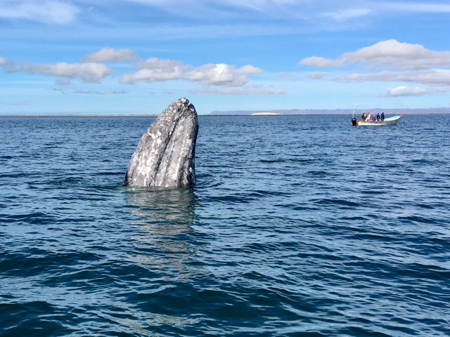 The one not-to-be-missed excursion from San Ignacio is a visit to the gray whales in the Laguna San Ignacio. Each year the gray whales return to one of three locations on the Pacific coast of Baja: San Ignacio, Laguna Ojo de Liebres just south of Guerrero Negro, and San Carlos on the Bahia Magdalena, just west of Ciudad Constitución. During the mid-December through March birthing season local fishermen become tour guides, shuttling small groups out into lagoons heaving with mama and baby whales. The whales are very playful, circling the boats, diving deep under the water and lifting the boats out of the water with big exhalations, breaching, lunging, spy-hopping, bow-riding, porpoising, lob-tailing, and slapping. They pop up, just out of reach, then closer and closer to the boat until finally the mama comes up for a little human love. Later in the season, the mama whales actually push their babies towards the boats, introducing their wee wanes to humans. The Baja Divide route travels the 42-miles from town to the Laguna de San Ignacio. The first half is rolling, beautifully paved road, the second half is a grueling slog through the salt flats on gnarly, never-ending washboards. Once you reach the laguna there are a number of whale-watching tour operators that offer lodging, food, and boat trips out to commune with the whales.