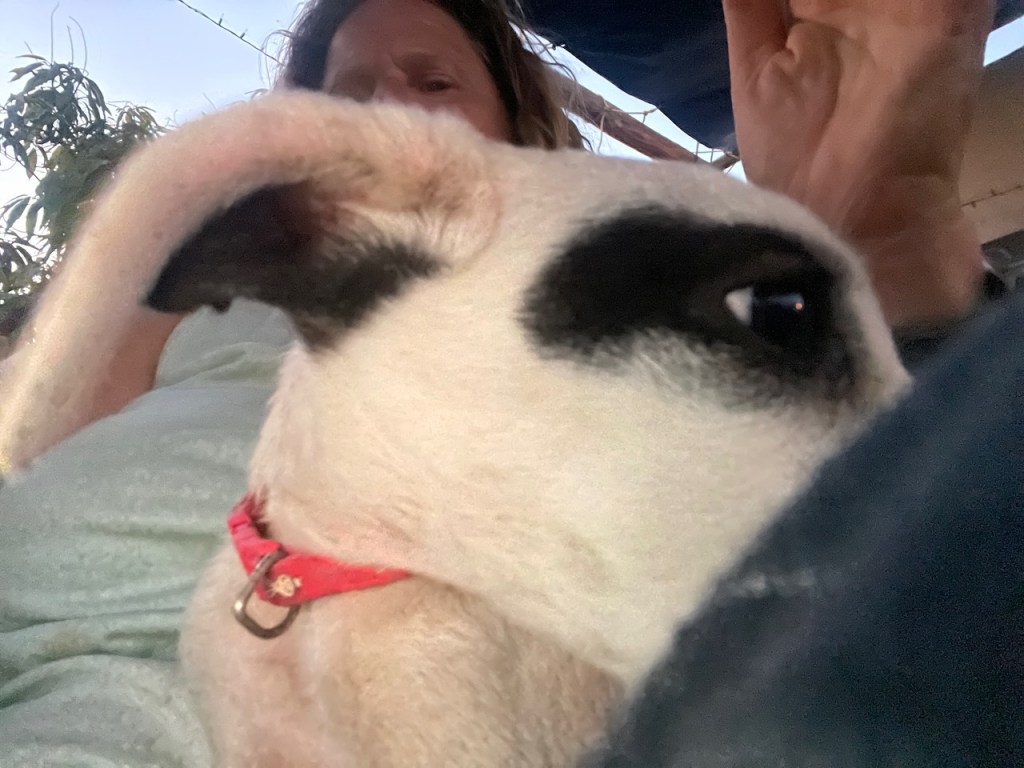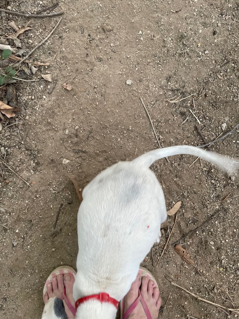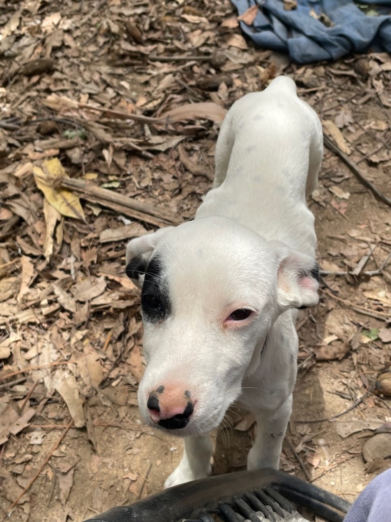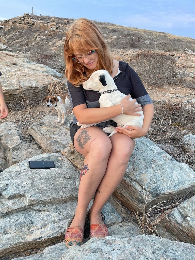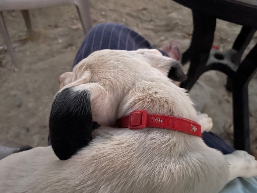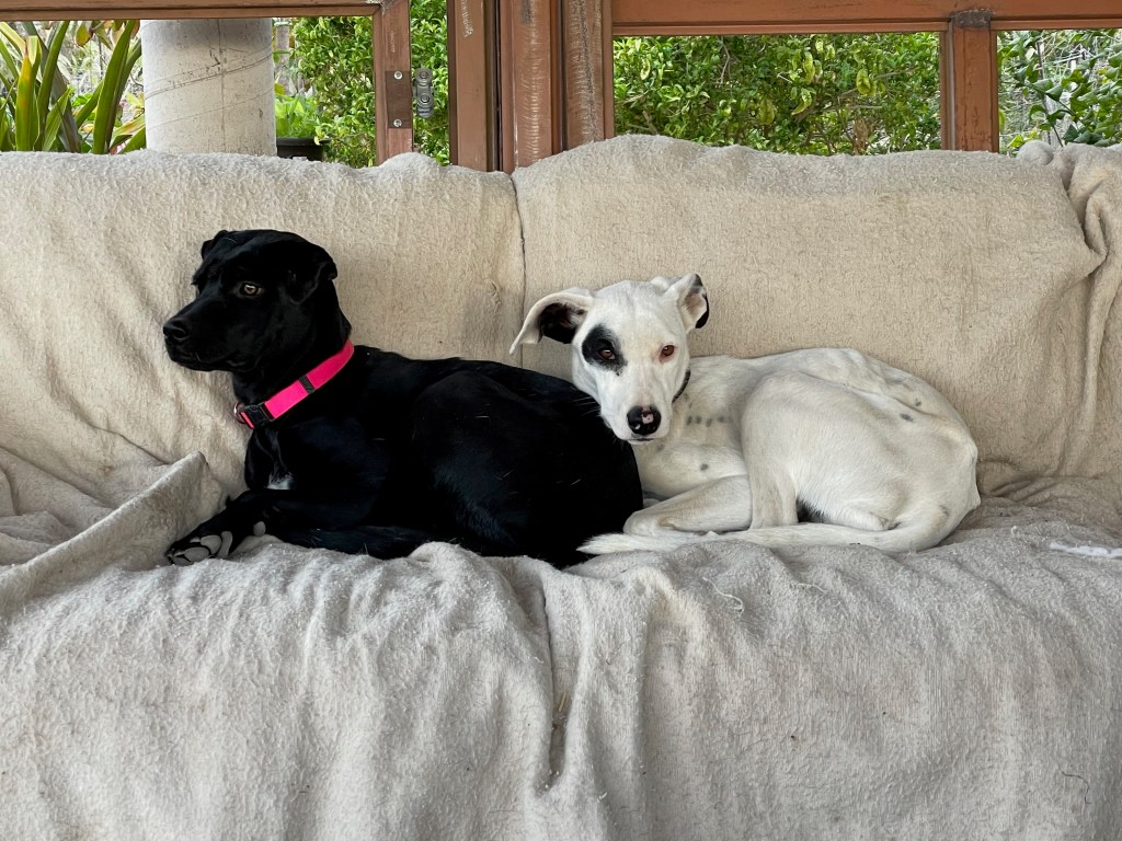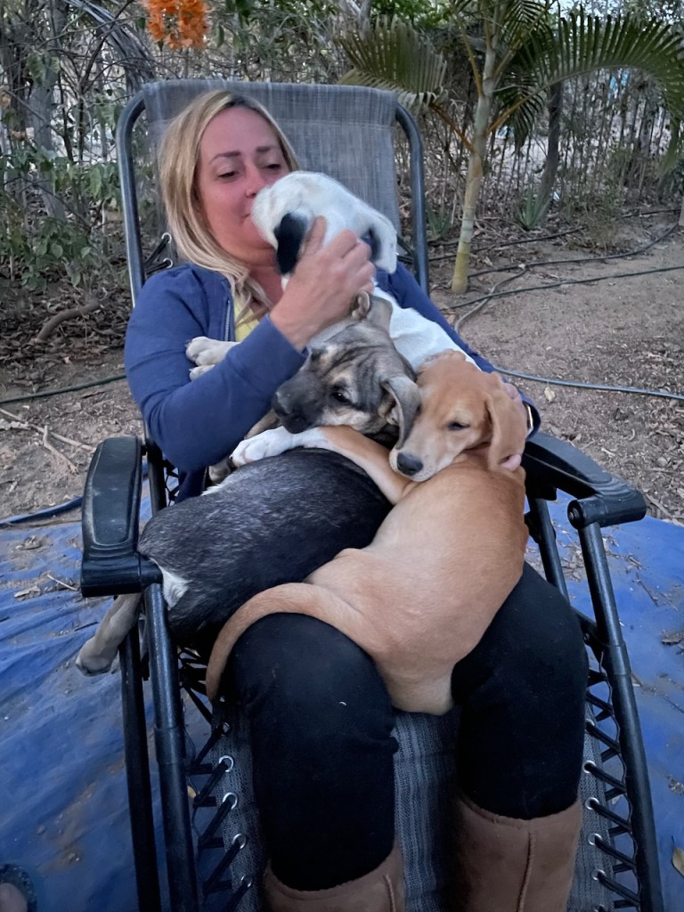 Banshee and her sister Catrina arrived on March 23. If you were looking for a pair of pups these two would be perfect and they would thrive in each other’s company. They had been rescued from an arroyo by a local family and cared for until I took them in. While Banshee can be very sensitive and timid little girl, she loves tearing around the yard and wrestling with her pack-mates, especially her sister. But she is always ready for a snuggle in my lap, happy to just curl up and go to sleep. Banshee has been spayed; given Bravecto flea and tick meds; is fully vaccinated; and is ready for adoption locally. If you live up north, dogs are required to have their rabies vaccination one month before flying, so she can fly as early as June 12. Being the sensitive girl she is, I believe a peaceful home will be best for her. She loves to play with other dogs and she is very sweet with people, but a super calm and loving home would be best for this precious little puppy!