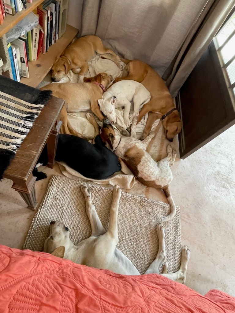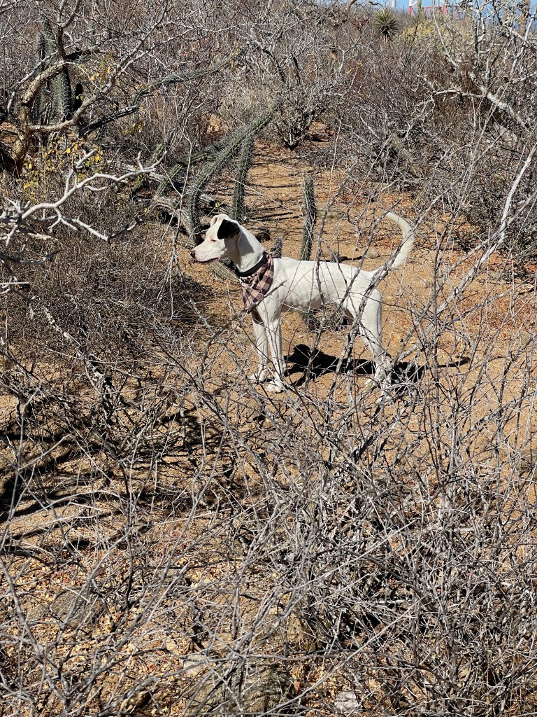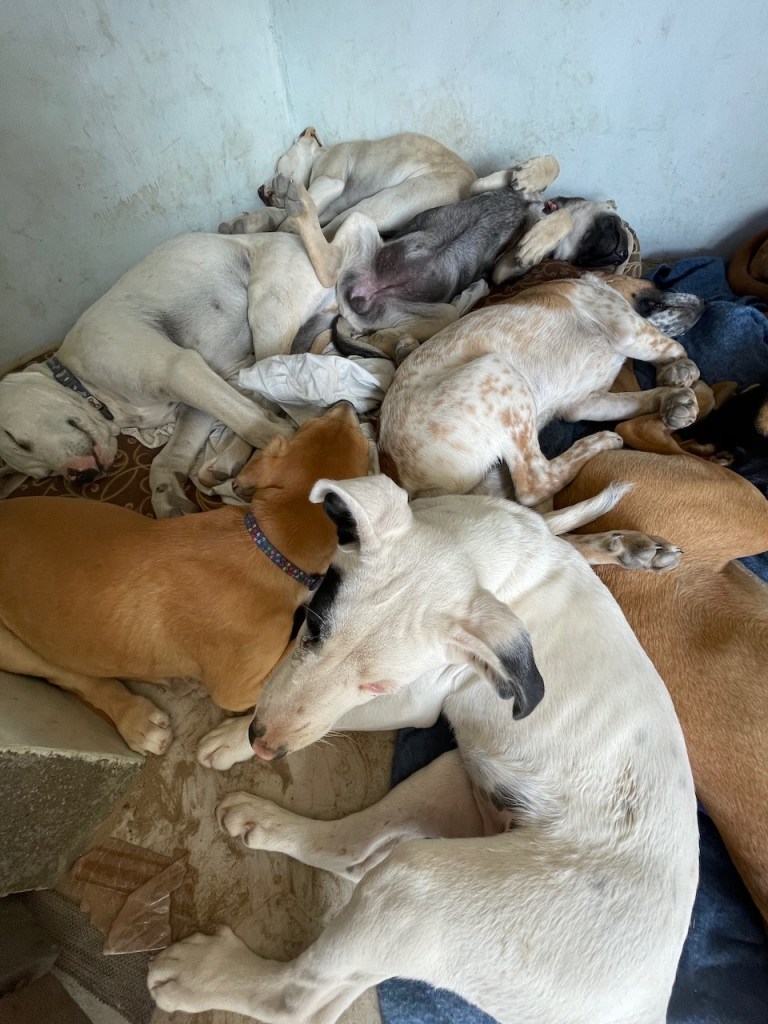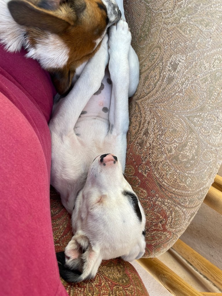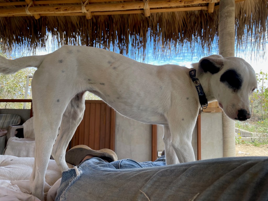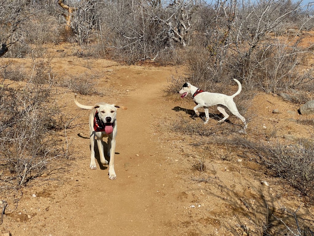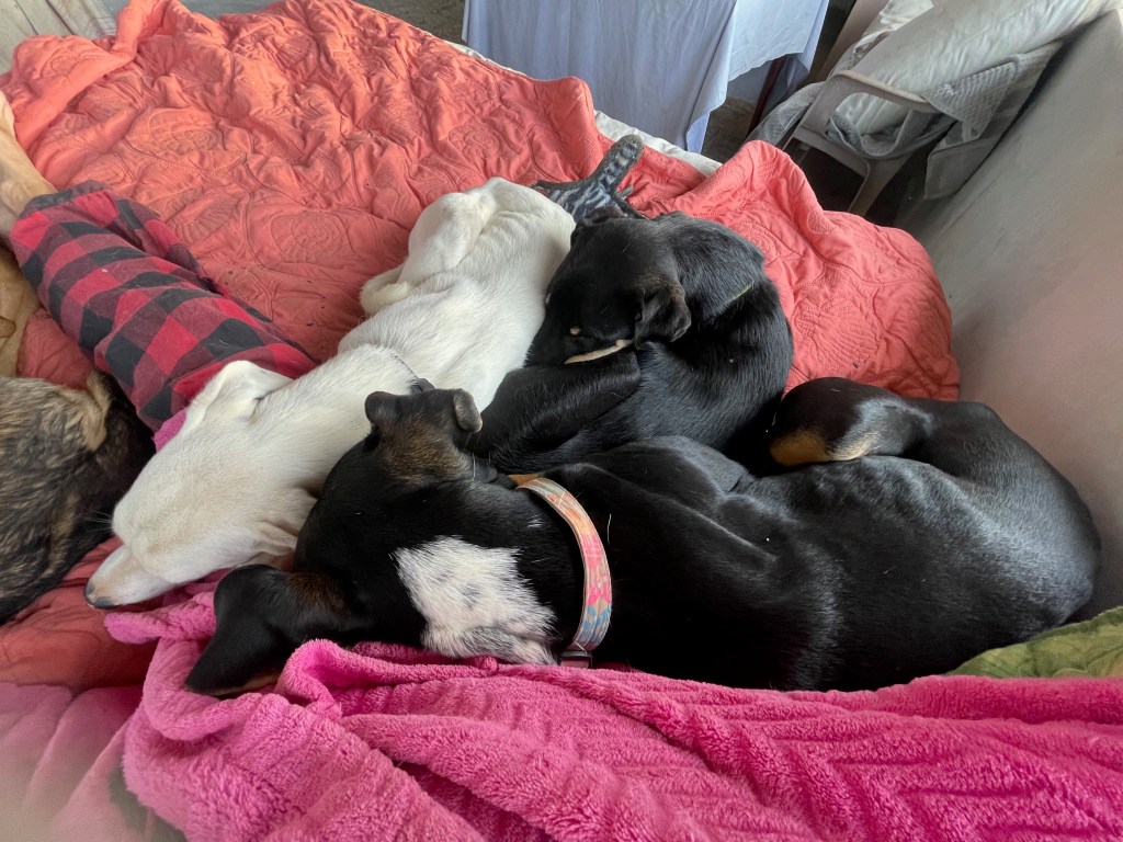 Banshee and her sister Catrina arrived on March 23. If you were looking for a pair of pups these two would be perfect and they would thrive in each other’s company. They had been rescued from an arroyo by a local family and cared for until I took them in. While Banshee can be very sensitive and timid little girl, she loves tearing around the yard and wrestling with her pack-mates, especially her sister. But she is always ready for a snuggle in my lap, happy to just curl up and go to sleep. Banshee has been spayed; given Bravecto flea and tick meds; is fully vaccinated; and is ready for adoption locally. If you live up north, dogs are required to have their rabies vaccination one month before flying, so she can fly as early as June 12. Being the sensitive girl she is, I believe a peaceful home will be best for her. She loves to play with other dogs and she is very sweet with people, but a super calm and loving home would be best for this precious little puppy!