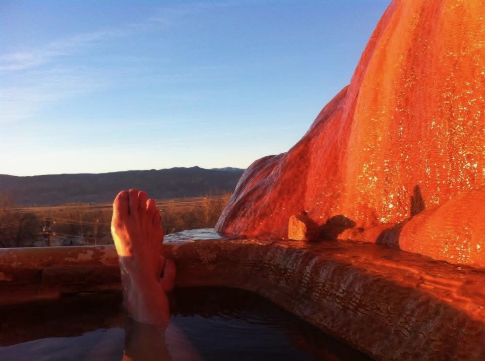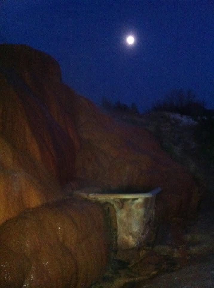 That second day I broke my cardinal rule, I drove more than seven hours from Boise to Monroe Utah, home of Mystic Hot Springs, thanks to the recommendation of my friend Maurice Tierney. The name does not do it justice. This is a slice of heaven in Utah. It was a long haul and I was sure happy to be there! Mystic is a complete hippy enclave in all the best ways. There were dogs off leash everywhere, no problem; lots of trails to hike in the foothills; school bus, cabin, camping and RV accommodations; few people and fewer rules; best of all was the hot springs! They have a proper geo-thermal heated swimming pool, but even cooler are the old claw foot bathtubs nestled into overflowing water which creates weird and wonderful sculptures which envelope the tubs. The first night I hung out around the campfire with a cool couple who criss-cross the country in their RV and a rather uptight motorcyclist from Denver. I soaked in a bathtub under a nearly full moon and was really happy I had Luna by my side that night. It was a true three-dog night, I awoke to a frozen solid water bottle, but I had to settle for just my one dog.